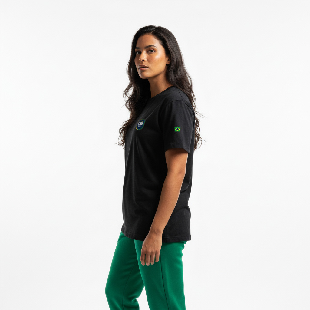 Seu corte moderno valoriza o corpo sem prender os movimentos, enquanto a cor preta sólida garante que a peça nunca saia de moda. O acabamento de alto padrão e as estampas icônicas. Logo CBB frontal e Brasil dorsal fazem desta camiseta o uniforme oficial dos apaixonados pelo jogo.